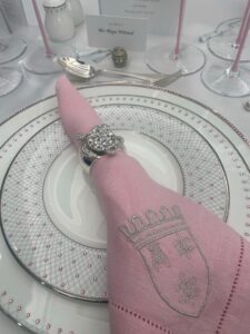 テーブルデコレーションは、私の好みではありませんでしたが、こだわりを感じるものでした。ピンクがテーマカラーだったのか、ナプキンもワインのステム部分もピンク。