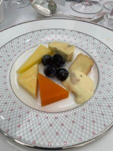 お料理はお世辞にも「美味しい!」とは言えませんでしたが、ワインのセレクションは豪華でした。モンラシェやマルゴーなどが出てきたので、アマチュアワイン家の夫も大喜び。美味しいワインとともに、チーズをいただきました。