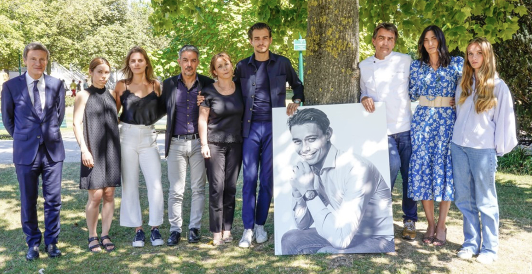 写真右から3番目がヤニック・アレノ氏。木を挟んで隣が長男のトマ・アレノ氏、そして母親のイザベルさんです。